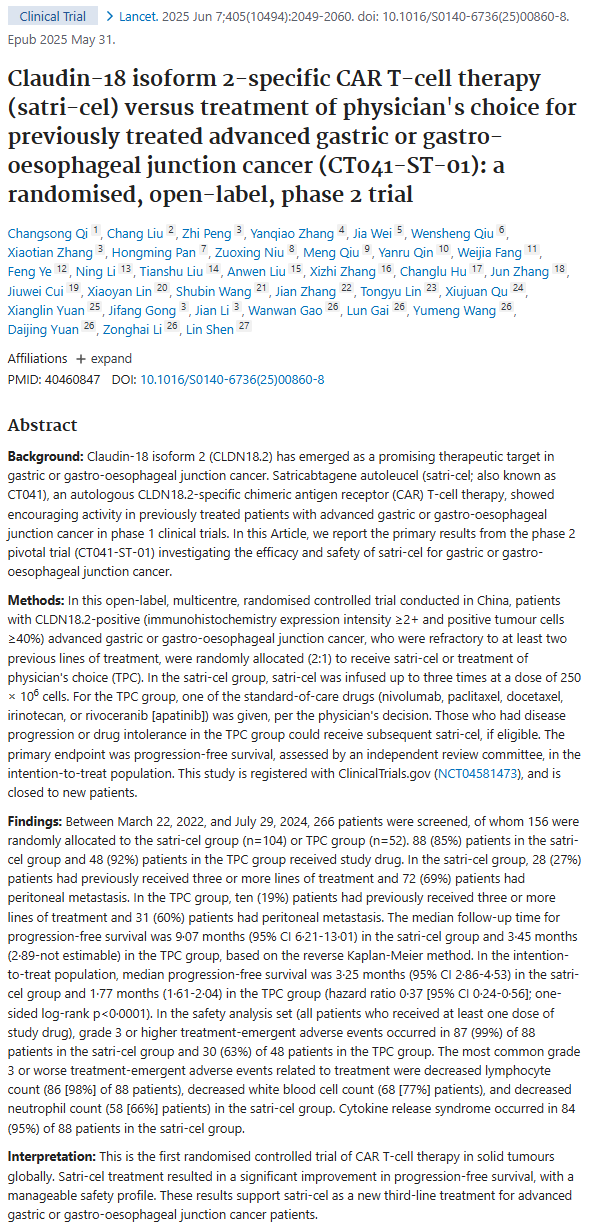 背景:CLDN18.2 は進行胃/胃食道接合部がんにおける有望標的であるが、CAR‑T療法のRCTによる評価は初。