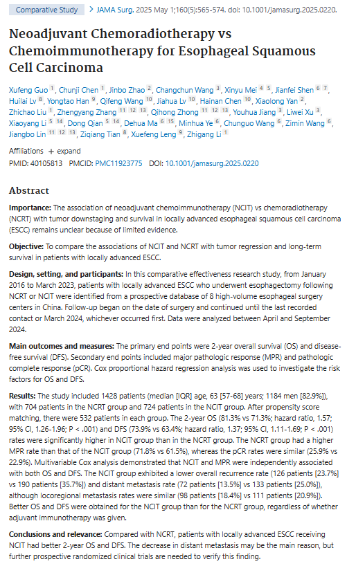 方法:2016~2023年、中国の8施設でNCRTまたはNCIT後に食道切除を受けた進行ESCC患者1,428例を前向きデータベースから抽出、傾向スコアマッチング後に2年生存および無病生存を比較。