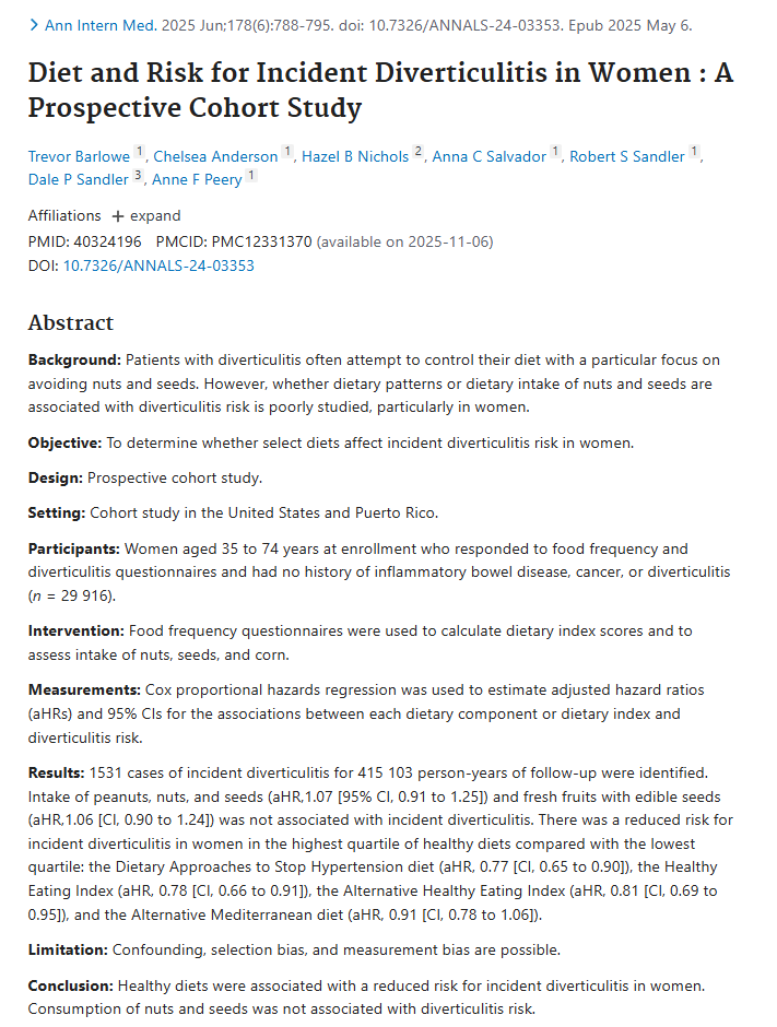 背景:憩室炎患者はナッツや種子を避ける傾向があるが、その食事と発症リスクの関連性は未解明だった。