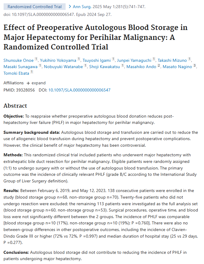 背景:肝門部悪性腫瘍に対する大規模肝切除では大量出血が予想され、自己血貯血による術後肝不全(PHLF)の低減が検討されてきたが、効果は不明だった。