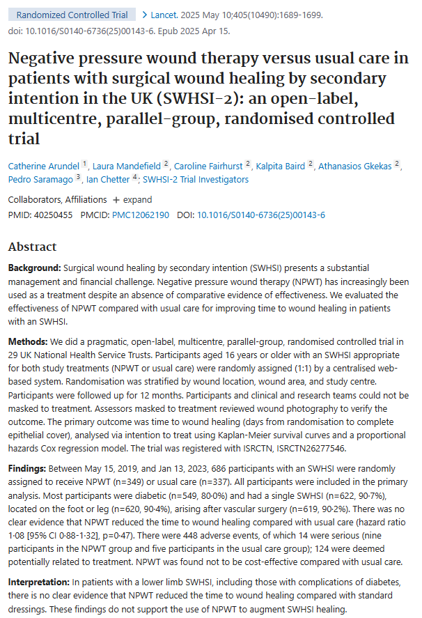 考察:NPWTは創傷治癒までの時間短縮に有意な効果なし(HR 1.08, P=0.47)。有害事象・費用対効果も標準治療と比較して明確な利点なしとされた。