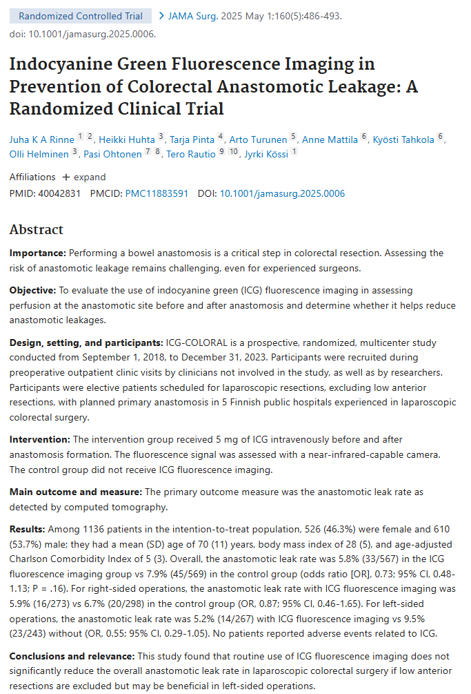 方法:2018〜2023年のフィンランド5施設前向き多施設RCT。吻合前後にICGを静注し、近赤外カメラで血流確認。通常術と比較してリーク率を評価(計1,136例)。