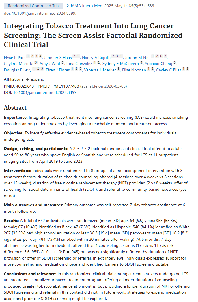 肺がんスクリーニングにおける喫煙治療統合:Screen Assist 因子別無作為化臨床試験