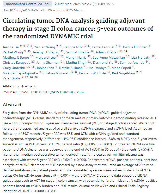- 循環腫瘍DNA解析によるステージ II 大腸がん術後補助療法の指導:DYNAMIC 試験の5年転帰
