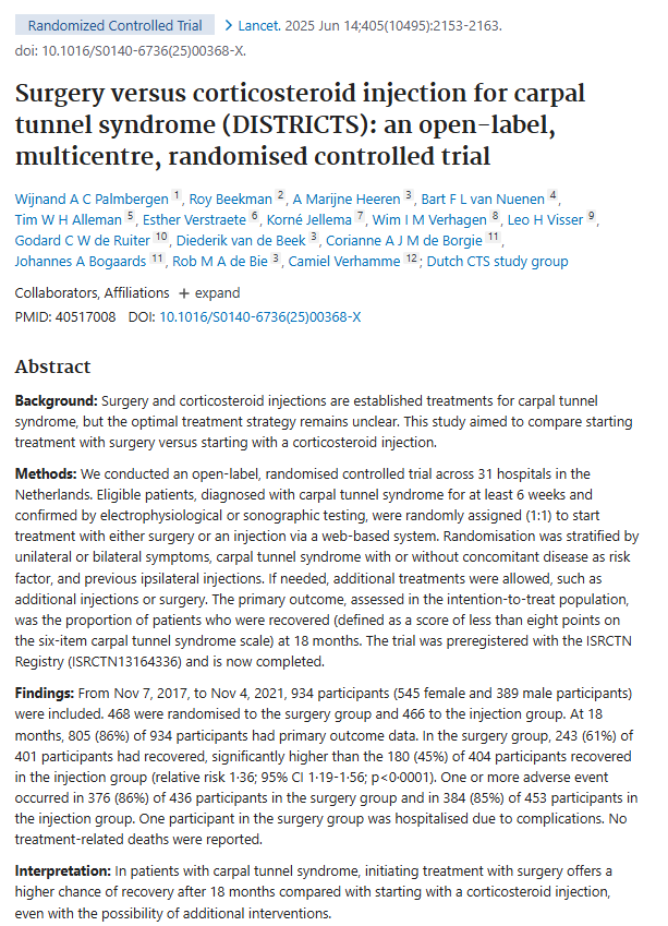方法:オランダ31施設で、確電・画像検査で診断された934名を対象に、手術群と注射群に無作為割付(2017–2021年)。主要評価は18か月後の回復率(CTSスコア<8)。
