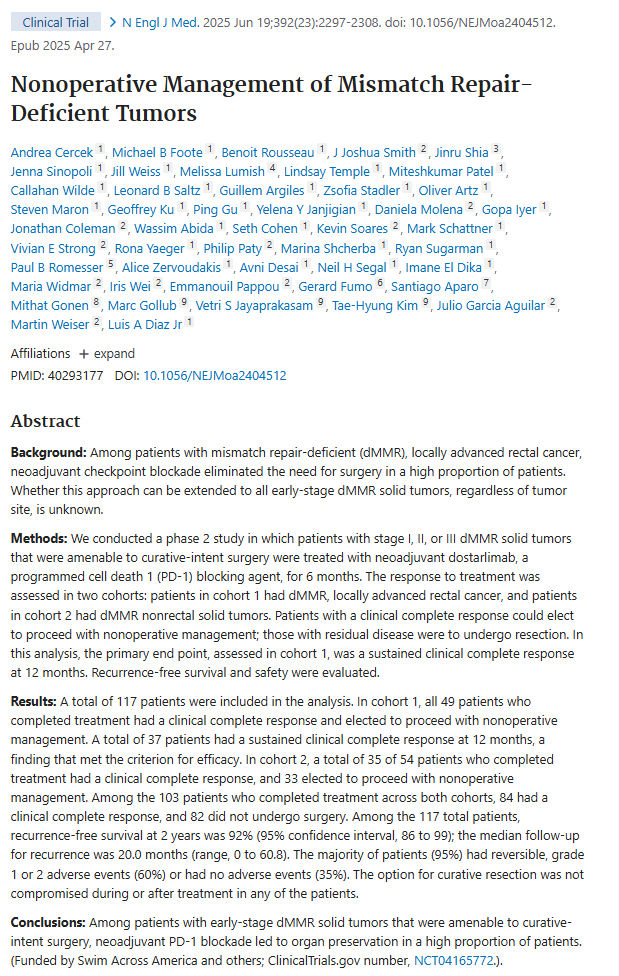 方法:ステージⅠ–Ⅲの dMMR 固形腫瘍患者(直腸がんおよびその他を含む計117例)に対し、術前に PD‑1 抑制薬 dostarlimab を6ヶ月投与し、臨床的完全奏効なら手術回避。
