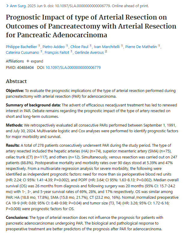 考察:90日死亡率5.4%、重大 morbidity 47%。中央値OSは診断から26ヶ月、手術後20ヶ月。1‑, 3‑, 5‑年生存率は69%、28%、17%。HA、SMA、CT 間で生存に有意差なし。正常 CA19‑9 や低Tステージの方が予後良好。切除動脈の種類ではなく、腫瘍の生物学的特性が予後を左右。