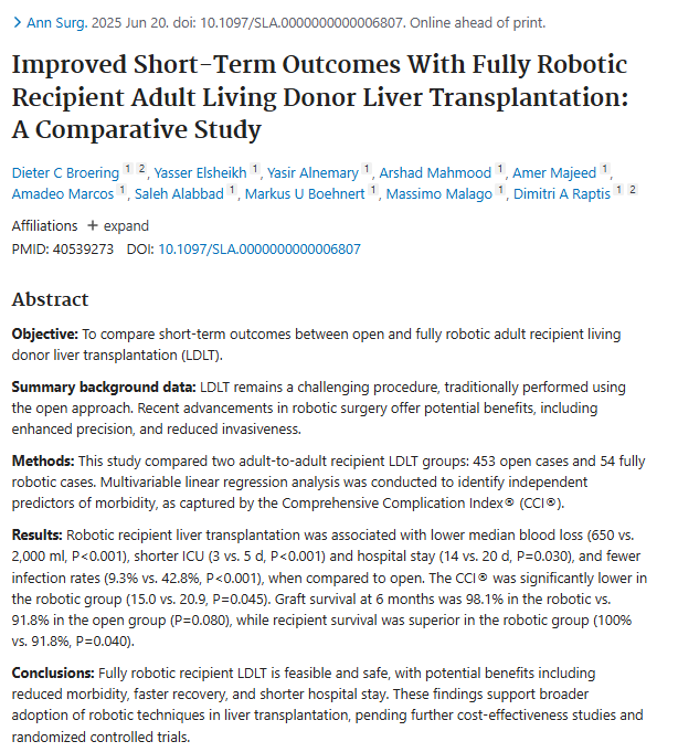 背景:生体肝移植(LDLT)は難易度が高く、従来は開腹手術が主流であったが、ロボット手術の安全性・利点が注目されていた。