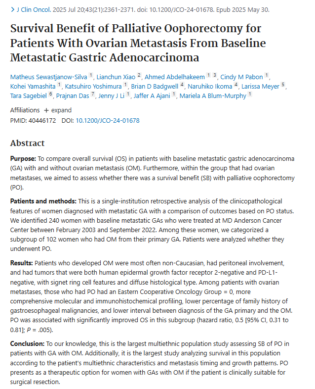 方法:米国MDアンダーソンがんセンターにて、2003–2022年に進行胃腺がんと卵巣転移を有した102名女性を対象とした後ろ向き単施設解析。卵巣摘出術(PO)を受けた群と非手術群で比較。