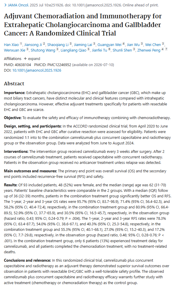 方法:ACCORD RCT(2020〜2022年)、手術後のEHC/GBC患者93名を対象に、カムレリズマブ+フルオロピリミジン系化学放射線療法群と観察群にランダム化し、安全性と生存に関する追跡(中央値36か月)を評価。
