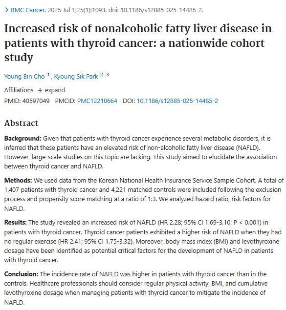 - 甲状腺がん患者における非アルコール性脂肪肝疾患(NAFLD)のリスク増加:全国コホート研究