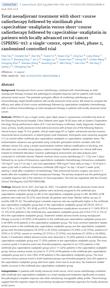 - 短期放射線療法+sintilimabとCAPOXによる全ネオアジュバント療法 vs 短期放射線療法+CAPOX単独:局所進行直腸がんに対するSPRING‑01第II相試験