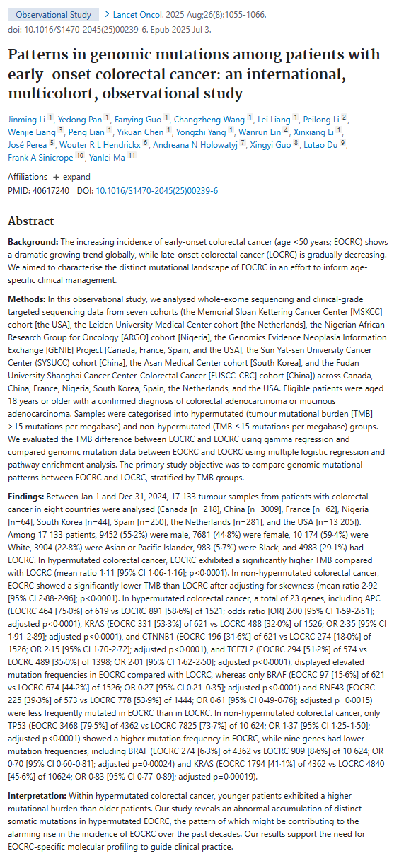 - 若年発症大腸がんにおけるゲノム変異の傾向:多国籍観察コホート研究