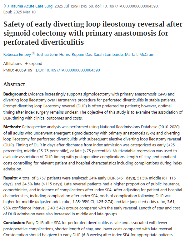 - 穿孔性憩室炎に対するS状結腸切除後+一時的回腸ストーマに関するストーマ早期閉鎖の安全性