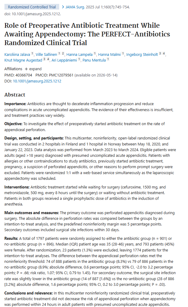 虫垂切除を待つ間の術前抗生物質投与の役割:PERFECT-Antibiotics 非劣性RCT