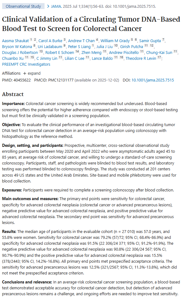 方法:米国27,010名の無症候・平均リスク成人を対象に、ctDNAベースの血液検査とコロノスコピーを比較。主要評価は感度・特異度・陽性的中率・陰性的中率。