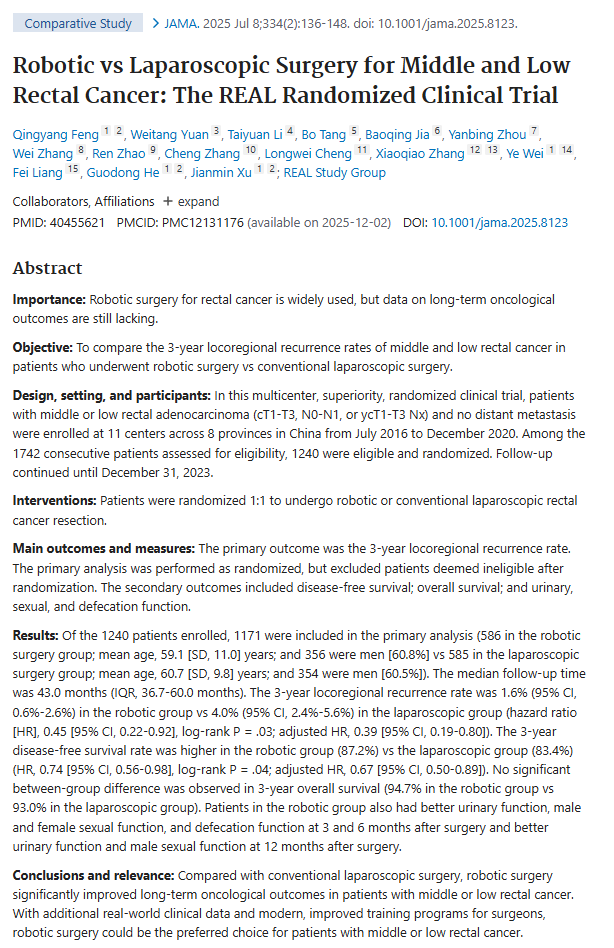 中・下直腸癌に対するロボット手術 vs 腹腔鏡手術:REAL 無作為化臨床試験